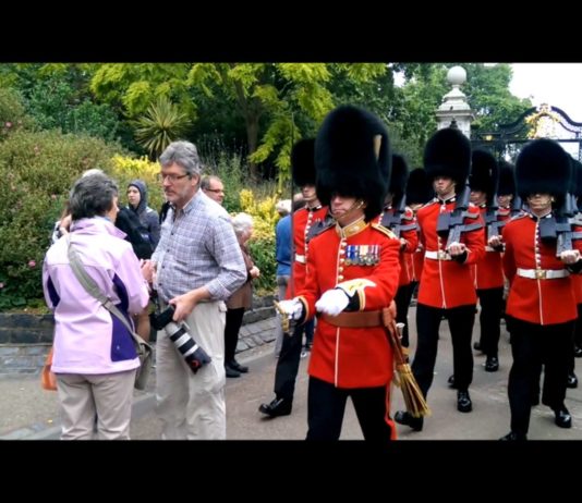 イギリスで行進する衛兵とそれに気づかない男性とが接触する