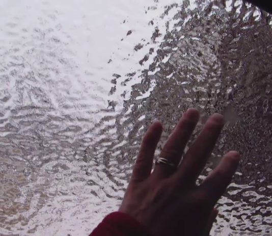 車のドアのガラスに綺麗に付着した氷を割って見せる男性