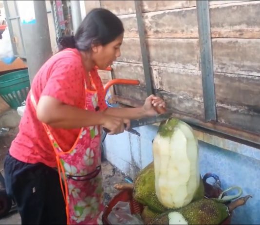 巨大なジャックフルーツを見事な手さばきでさばいていく女性
