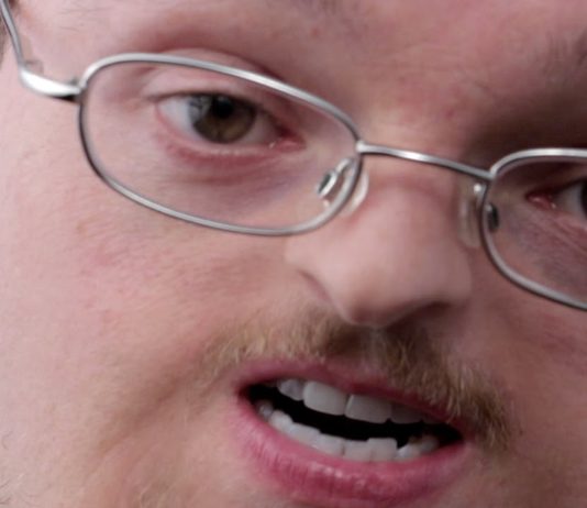 顔が変形した男の人が甲高い声で何かを叫んでいる動画