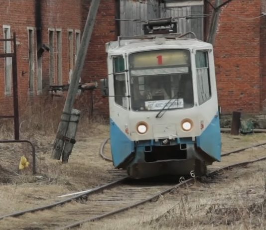 ロシアの小さな路面電車の走行シーン