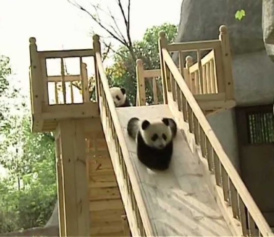 滑り台で思いっきり遊ぶ、コロコロ子パンダたち