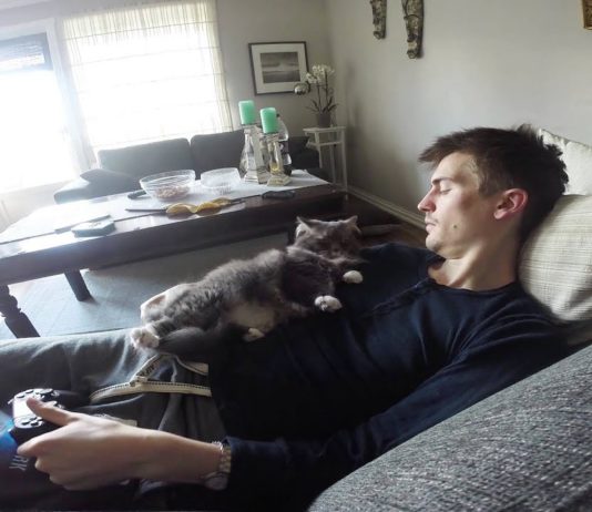 男性がテレビゲームをしているとすぐにすり寄ってくる猫