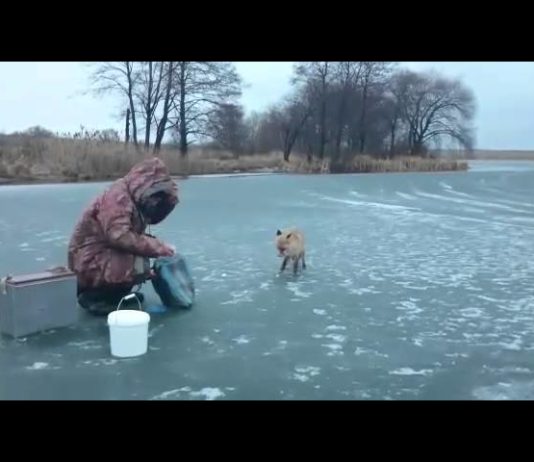 凍った水の上で釣りをする人から直接餌をもらう狐