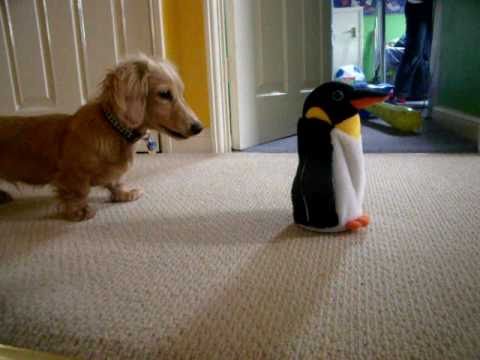 ペンギンのおもちゃと犬がどちらが強いか検証した動画