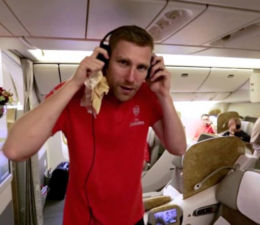 アーセナル仕様のボーイング777で移動するアーセナルの選手たち